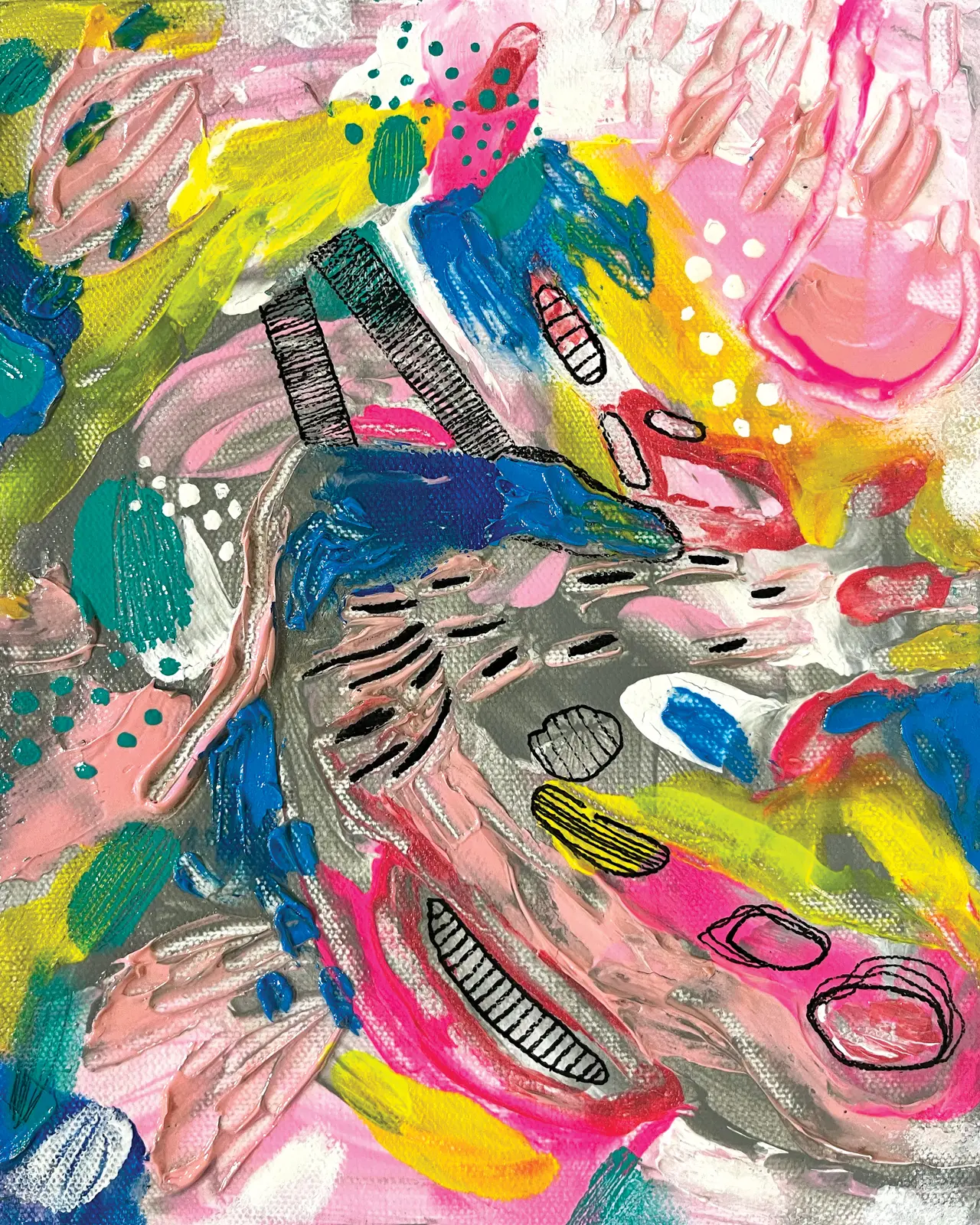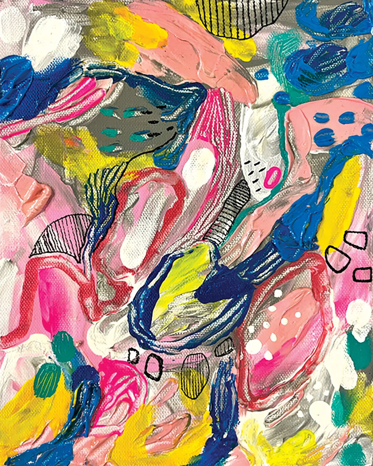 My paintings are abstract expressionism, with very dominant colors, textures, and layers. The story behind my art is made of emotions, music, and memories.